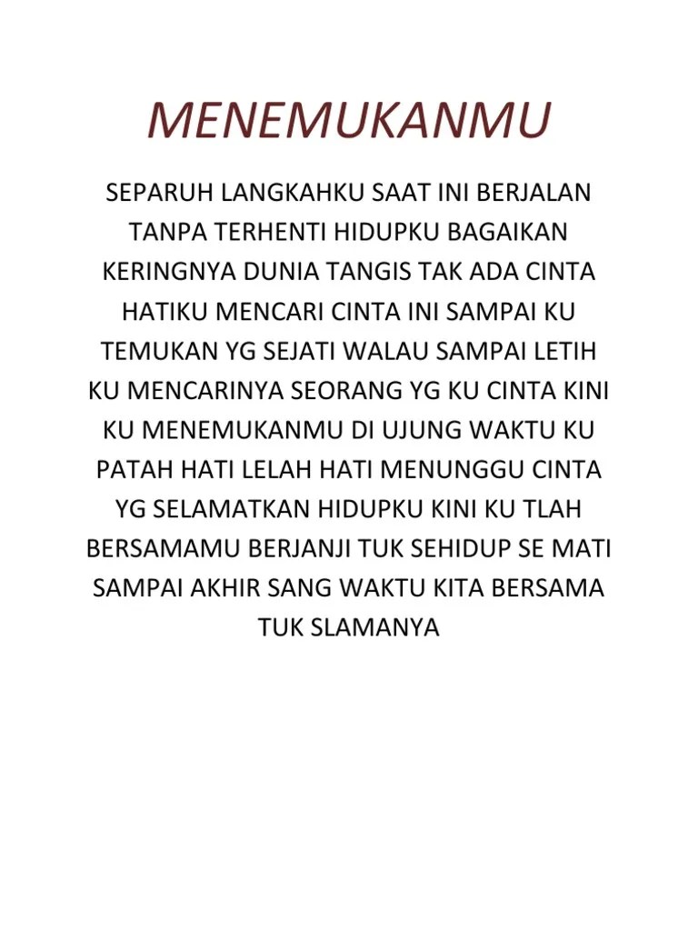 Di ujung waktu ku patah hati begitulah lirik lagu menyedihkan milik seventeen ini. Berikut ini merupakan lirik lagu kini ku menemukanmu yang dicover oleh nabila suaka di channel youtube pribadinya. Di ujung waktu 'ku patah hati. English translation of lyrics for menemukanmu by seventeen. Kini ku menemukanmu di ujung waktu ku patah hati lelah hati menunggu cinta yang selamatkan hidupku kini ku tlah bersamamu berjanji tuk sehidup semati